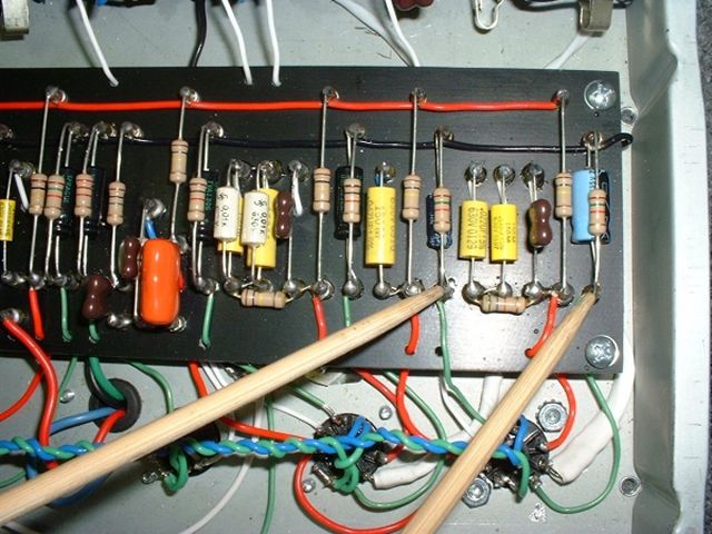 We began working on the final tweaks to the tone. While I had asked Mikey for a bright amp, after playing it extensively, I'd determined it was too bright overall. Mikey decided to remove the large red capacitor in the negative feedback loop that was acting like a fixed presence control.