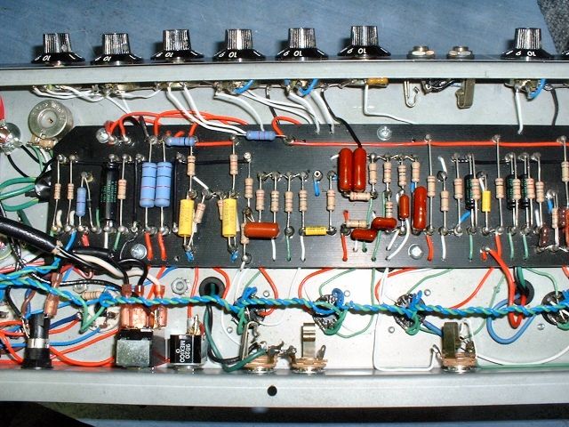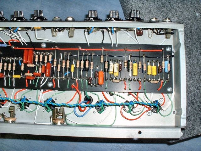 Another thing I'd noticed with the Normal channel was that the signal was too hot. For my tastes, it's nice to have this a little hotter than the Vibrato channel. Mikey dialed it back a bit for me by changing a some resistors connected to the first 12AX7 tube. If you are familiar with 12AX7 tubes, you will know it actually houses two triodes, so the 12AX7 is known as a dual triode tube.