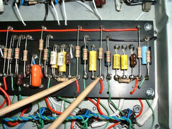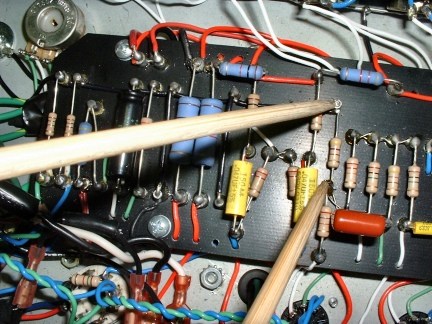 Mikey also changed the cathode resistors for V1A and V1B from 820 ohms to 1W/1.5K ohms. Here's a photo with chopsticks pointing to the turrets for the identical V1 cathode resistors.