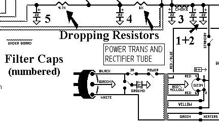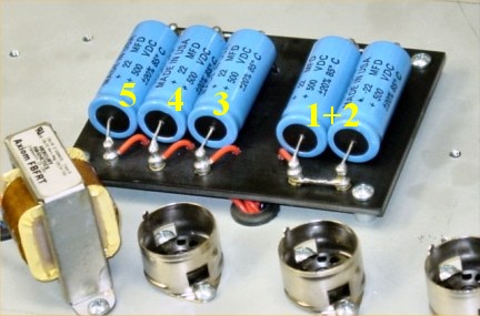 Filter caps 1 & 2 in parallel. Filter caps 3, 4, 5 for other amp sections.