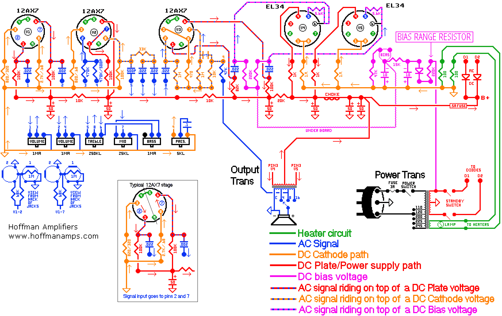 In trying to learn and write about these sections of the amp, I’ve found myself going back to Doug’s site a number of times today. It is chock full of information and diagrams to help people like me understand what our amps are doing. For convenience, here’s a link to the Hoffman Amplification Library of information.