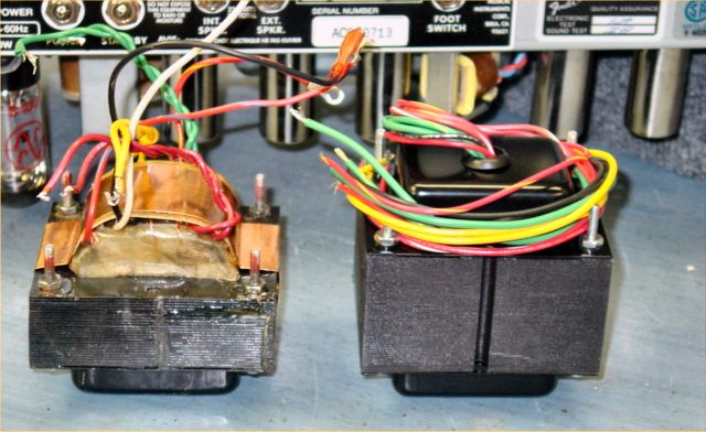 The stock reissue PT does an OK job of supplying the required voltages to the circuit however the overall PT's behavior under working conditions is not the same as the original vintage Deluxe Reverb PT. Characteristics that make the reissue PT different than the original PT involve flux density, AC regulation and primary inductance. These characteristics are a very important factor for the player that wants to nail the tonality of the vintage Blackface Deluxe Reverb amp.