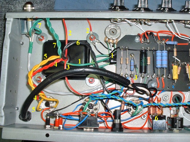 7. The two twisted Green wires supply the 6.3 volts AC needed to power the pilot light and then the filament heaters of the preamp tubes. As you can see, they are attached first to the pilot light assembly.