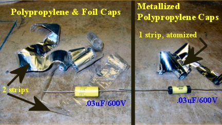 Film and foil caps are much bigger than metallized caps. You can see this in the picture above. Both caps have the same .03uF/600V rating, but the polypropylene and foil cap is much larger/rounder than the metallized polypropylene cap on the right. On the left, the metal foil is less shiny and crinkled looking when unraveled. On the right, the metal looks very shiny and smooth since the metal was sprayed directly on to the dielectric (the polypropylene film).