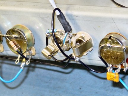 Another enhancement Mikey makes from the stock DRRI is that he removes the Fender pots and jacks attached to the PCB and replaces them with new pots and jacks; wiring them directly to the appropriate parts of the circuit. He uses CTS and Alpha pots and Switchcraft jacks.