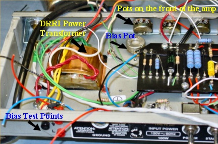 Here’s a close-up of part of the chassis interior with some features of the amp highlighte DRRI chassis with the main board installed