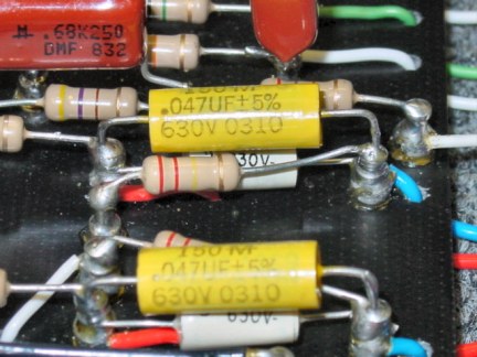 Cap Stacking using .047uF caps (top - yellow) and .01uF caps (bottom - white)