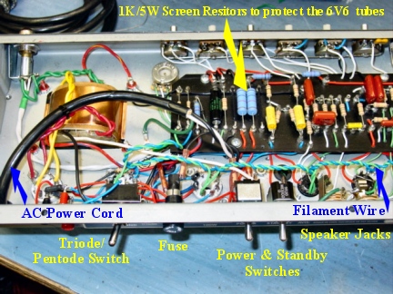 There are only a couple of items to finish on the build. All the remaining hookup wires are connected to the pots, jacks and switches. The Triode/Pentode switch gets installed and all of the tubes must be powered using filament wire. If you glance back at the pentode circuit diagram in the “Design Details” section, you can appreciate that the filament wires are connected to the cathodes of every tube. This heats up the cathodes so they start emitting electrons.