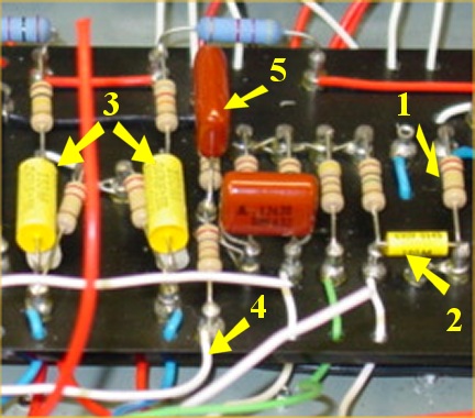 5. Take a look at the red capacitor on top of the resistor (#5). This cap acts like a fixed presence control in the NFB circuit. (Note that in my third visit to Mikey, this cap was removed. Ultimately, it had made the amp too bright overall.)