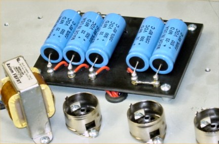 The new filter cap board is a thing of beauty. In a quest for the best components, Mikey chose to use something other than the traditional Spraque Atom capacitors, although these are similar in appearance. They are smaller but have higher specs. For example, the Sprague 20uF caps are rated for 65 degrees centigrade whereas these can go to 85 degrees centigrade. Their tolerances are also tighter.